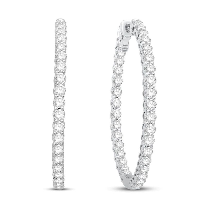 Brilliant round diamonds line the fronts and the inside of the backs to create a unique look in these exquisite women's hoop earrings. Fashioned in 14K white gold, the total diamond weight is an impressive 6 carats and the earrings secure in place with snap-lock backs.