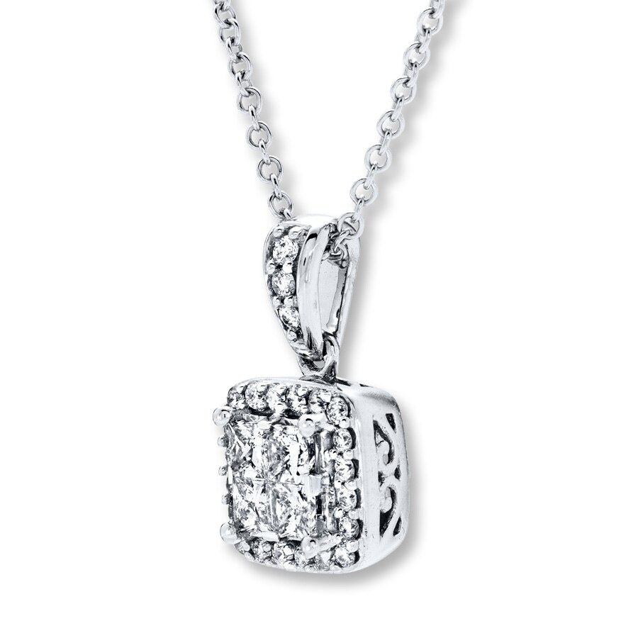 Four princess-cut diamonds are beautifully framed in round diamonds in this gorgeous necklace for her, crafted of 14K white gold. The necklace has a total diamond weight of 1/2 carat. The pendant sways from an 18-inch cable chain that secures with a lobster clasp. From the Four One? Collection.