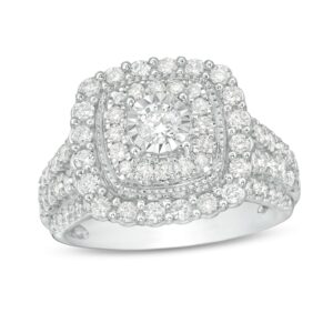 This dazzling necklace showcases a vertical row of three graduating round diamonds suspended over a circular pendant adorned in marquise and round-cut diamonds. Fashioned in 14K white gold, the diamonds total 2 carats in weight. The pendant sways from an 18-inch cable chain that secures with a lobster clasp.